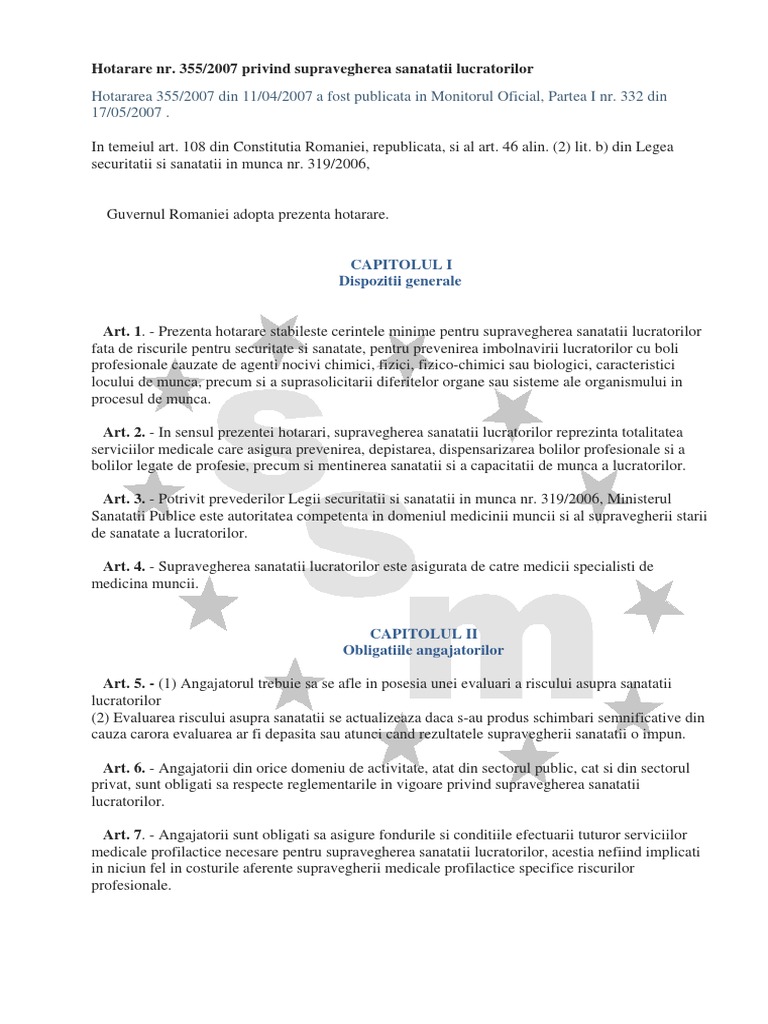 Pentru detaliile legislative amintite vă rugăm să ne contactaţi şi vă vom răspunde cât mai repede posibil. Hg 355 privind supravegherea sanatatii lucratorilor in vigoare din cap i dispozitii generale pdf dwrean lhpsh. 355 din 11 aprilie 2007 privind supravegherea sănătății lucrătorilor.